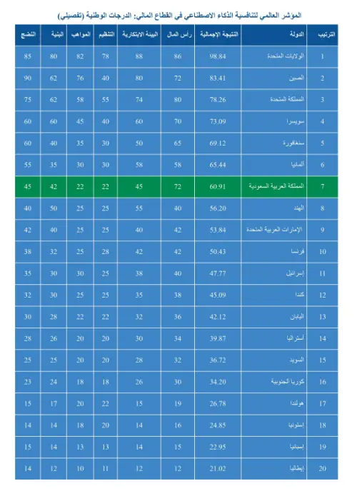 احتلت المملكة العربية السعودية المرتبة التاسعة عالمياً في مؤشر “التنافسية العالمي للذكاء الاصطناعي” في القطاع المالي، الذي أصدرته مجموعة “المعرفة العميقة” (Deep Knowledge Group)، بالتعاون مع “مجلس تطوير الخدمات المالية” (FSDC) في هونغ كونغ بصفته جهة مراقبة.